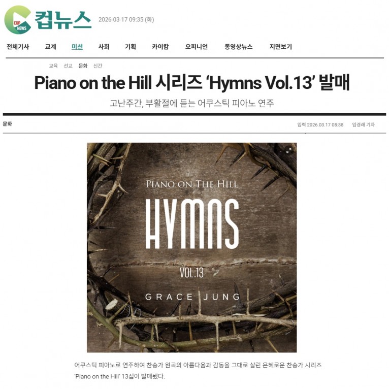 [기사] Piano on the Hill 시리즈 ‘Hymns Vol.13’ 발매(크리스챤연합신문 컵뉴스)