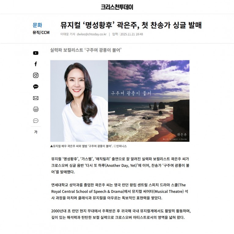 [기사] 뮤지컬 ‘명성황후’ 곽은주, 첫 찬송가 싱글 발매(크리스천투데이)