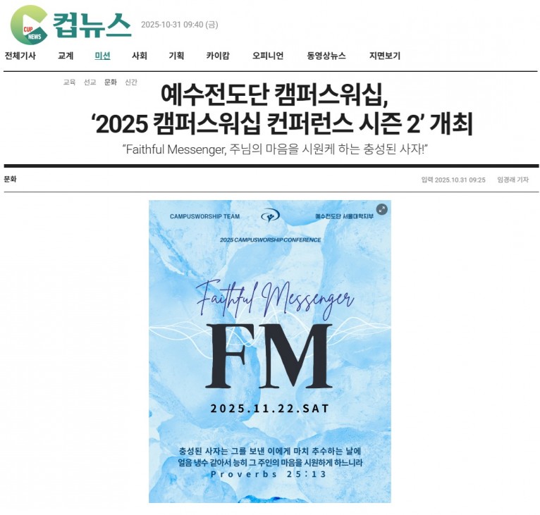 [기사] 예수전도단 캠퍼스워십, ‘2025 캠퍼스워십 컨퍼런스 시즌 2’ 개최(크리스챤연합신문 컵뉴스)